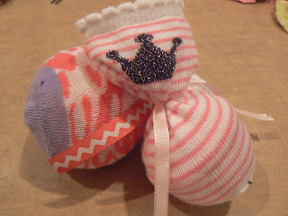My cousin Aimee is having a baby girl so to her gift I added these homemade Baby Rattles. I found the idea here but they used batting . . .